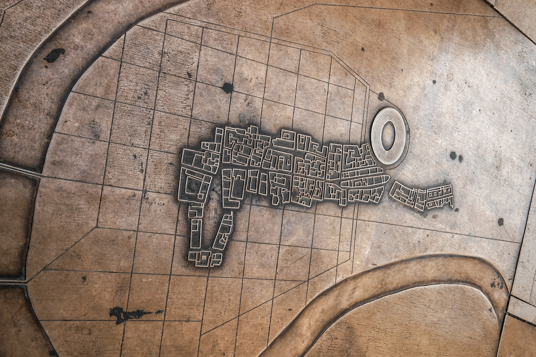 Карта города со «Колизеем». Город разделен на кварталы с достаточно четко выраженным параллельно — перпендикулярным строением улиц.
